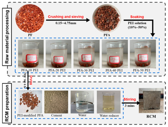 This study explored the impact of PEI on improving the surface features of PFs and the performance of RCM. PEI-modified PFA was prepared with various concentrations of PEI solutions, and the resulting RCM was analyzed to evaluate changes in pore structure, surface morphology, hydration processes, and the ITZ characteristics of the PFA before and after treatment.