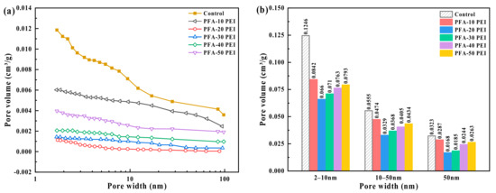The pore volume of PFA samples: (a) cumulative pore volume; and (b) differential pore volume.
