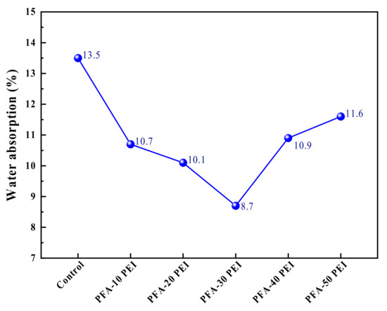 - The water absorption rates for PFA-10 PEI, PFA-20 PEI, and PFA-30 PEI were 10.7%, 10.1%, and 8.7%, respectively. These observations demonstrate the effectiveness of PEI in enhancing the performance of PFA by refining its pore structure and reducing its water absorption capacity.