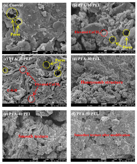 At a PEI concentration of 20%, the microstructure of the PFA undergoes significant changes, becoming more undulating with layered carbonate precipitates that create rough and complex segments. Figure 5d,e further illustrates substantial alterations in the surface morphology of the PFA treated with higher PEI concentrations. A honeycomb-like structure emerges as plate-like formations interconnect. When the PFA is treated with a 50% PEI concentration, the internal architecture shows a smoother and more continuous surface, with a uniform distribution and minimal variation in geometric shape. This results in a more refined and significantly enhanced plate-like structure compared to the PFA treated with a 40% PEI concentration. The morphological changes observed in the PFA microstructure indicate a complex interaction between PEI and the inorganic components of PFA, leading to these textural modifications. Lower PEI concentrations tend to cause aggregation or clustering of the fine aggregates, as seen in Figure 5b. In contrast, higher PEI concentrations are more effective in dispersing the fine aggregates and preventing their aggregation, resulting in a more uniform and improved microstructure.