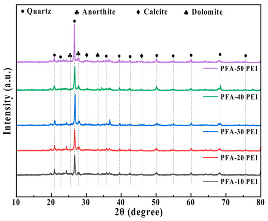 Figure 6 illustrates the XRD pattern of the PEI-modified PFA, demonstrating that the calcite and dolomite present in the samples remained inactive, not contributing to the hydration reactions. Following PEI modification, the PFA predominantly exhibited quartz-related diffraction peaks within the 20° to 30° 2θ range. As the PEI concentration increased from 10% to 50%, these quartz peaks intensified, with the most significant enhancement observed at a 30% PEI concentration. The increased PEI concentration resulted in the formation of a more continuous and dense surface coating layer, which effectively prevented the aggregation or deposition of silica particles on the PFA surface [35]. This process led to a smoother surface for the modified aggregate, which aligns with the SEM observations discussed earlier in Section 3.2.