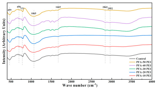 FTIR was utilized to identify the chemical bonds and functional groups present in the PFA by examining the transmission infrared spectra of the samples. Figure 7 presents the FTIR spectra, highlighting the spectral characteristics of both the untreated PFA and PEI-modified PFA within the wavenumber range of 400 cm−1 to 4000 cm−1. Notable peaks at 2842 cm−1 and 2952 cm−1 correspond to the C–H stretching vibrations, which are indicative of the PEI backbone. Additionally, the peak observed at 459 cm−1 is associated with the N–H bending vibration, characteristic of the secondary amine groups in the PEI structure. These spectral features provide valuable insights into the chemical interactions and functional group modifications resulting from the incorporation of PEI, enhancing the understanding of the material’s molecular composition and its impact on the physicochemical properties of PFA [36]. Furthermore, the absorption peaks detected at 1665 cm−1 and 1065 cm−1 may originate from the stretching vibrations of C=O in amides and C–O stretching vibrations, respectively. The formation of stable chemical bonds on the surface of the PEI-modified PFA is significant, as it reduces the likelihood of producing unwanted reaction by-products. This stabilization contributes to improved bonding performance, stability, and overall utility of the modified PFA [37,38].