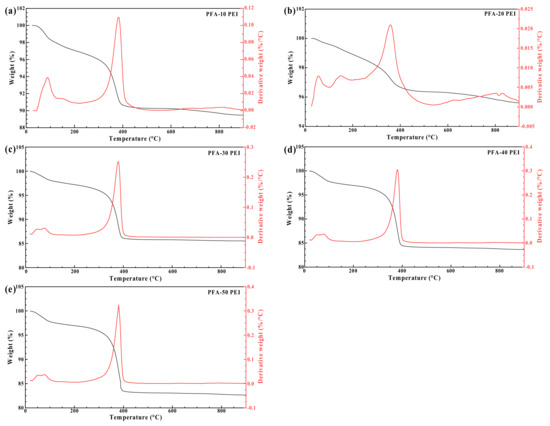 TGA results of PEI-modified PFA: (a) PFA-10 PEI; (b) PFA-20 PEI; (c) PFA-30 PEI; (d) PFA-40 PEI; and (e) PFA-50 PEI.
