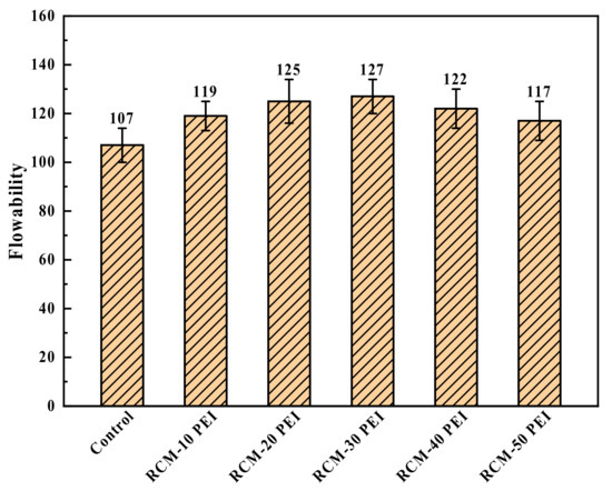 Figure 9 presents the flowability results for the RCM made with different concentrations of PEI-modified PFA. The inclusion of the PEI-modified PFA significantly improved the flowability of the mortar, aligning with previous findings related to the use of tannic acid-modified public fillers in polymer matrices. The average flowability measurements for the RCM with 10%, 20%, 30%, 40%, and 50% PEI-modified PFA were 119 mm, 125 mm, 129 mm, 122 mm, and 117 mm, respectively. Compared to the untreated RCM, these modifications resulted in increased flowability by 11.2%, 16.8%, 20.6%, 14.0%, and 9.3%, respectively. The RCM containing PFA modified with a 30% PEI solution demonstrated the highest flowability. This improvement is likely due to the reduced water absorption capacity of the PEI-modified PFA compared to the non-treated PFA, which would otherwise absorb free water from the mortar matrix and hinder the lubrication and flow of the mixture. Additionally, the potential for PFA particles to aggregate in the RCM matrix, which can negatively impact workability, is minimized with PEI modification, particularly at the optimal concentration.