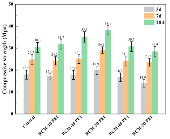 Figure 10 illustrates the impact of the PEI-modified PFA on the compressive strength of the RCM. The data show that the RCM made with the PEI-treated PFA exhibited higher compressive strength compared to the Control group without PEI modification. Initially, the enhancement in compressive strength was modest due to the inhibitory effect of PEI on the early stages of cement hydration. However, as the curing time increased, this inhibitory effect diminished. Among the different concentrations tested, the RCM with PFA modified using a 30% PEI solution exhibited the most significant improvement, showing a 20.5% increase in compressive strength at 28 days. This suggests that up to a 30% concentration of PEI effectively enhances the strength of RCM by improving the bond between the aggregates and the cement matrix. However, when the PEI concentration exceeded 30%, the compressive strength began to decline. Specifically, RCM-50 PEI had a compressive strength of 28.4 MPa, which was 6.7% lower than that of the untreated Control group. This reduction is likely due to the excessive accumulation of PEI on the surface of PFA, which hinders the cement hydration process, thus weakening the overall structure. Consequently, to avoid compromising the compressive strength, it is recommended that the PEI concentration for modifying PFA should not exceed 30%.