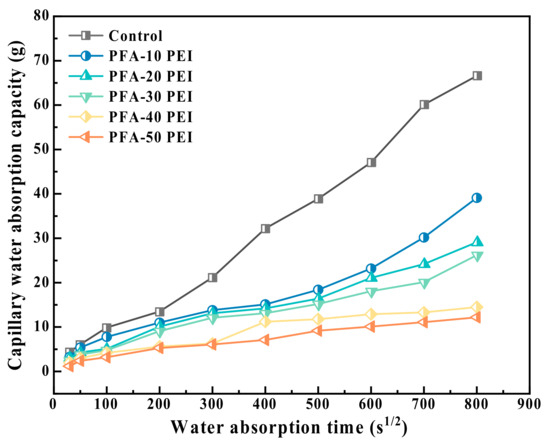 Figure 11 presents the CWAM curves over time for the different RCM samples. It is observed that the CWAM increased for all samples as water absorption progressed, with the Control group exhibiting a marked increase within the first 8 days compared to the modified groups. This behavior is likely due to the greater number of cracks and weaker interfaces formed in the untreated PFA during crushing, which created a network of pores and microcracks that facilitated faster water movement. In contrast, the CWAM for the PFA modified with the PEI solutions was notably lower, aligning with the findings from the pore structure analysis. The reduction in total porosity of the modified PFA mortar was achieved by the nanoparticles resulting from the reaction between PEI, calcium hydroxide (CH), and calcite, which helped to fill the pores, decrease pore diameters, and slow water transmission. Specifically, at a water absorption time of 807 s to the power of 1/2, the CWAM values were 66.6 g for Control, 39.1 g for PFA-10 PEI, 28.1 g for PFA-20 PEI, 25.9 g for PFA-30 PEI, 14.5 g for PFA-40 PEI, and 12.2 g for PFA-50 PEI. This corresponds to reductions in water absorption mass of 41.3%, 57.8%, 61.1%, 78.2%, and 81.7% for the respective PEI-modified samples, demonstrating the enhanced waterproofing properties of the PEI-modified PFA. As the RCM samples continued to absorb water, the rate of capillary suction gradually decreased and eventually stabilized. This stabilization occurred because as the internal moisture content increased, capillary suction slowed down and reached a steady state under the influence of gravity.