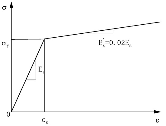 The equivalent ideal elastic-plastic bilinear model provided in Schedule C of the Code for the Design of Concrete Structures (GB 50010-2010) (2015 version) was used, and the modulus of elasticity during the strengthening phase was taken as 0.02 E. The curves of the concrete constitutive model are shown in Figure 2.