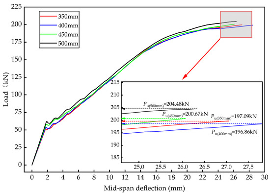 The deck width has a certain effect on the bending bearing capacity, which is the larger the width, the higher the bending capacity, but too wide of a deck will significantly increase the structural deadweight and, at the same time, lead to unfavorable local stresses on the deck. Therefore, it is necessary to analyze the correlation between the deck width and the bending bearing capacity. According to the experience of similar projects, combined with the standardized manufacturing dimensions of components, the deck width was taken as 350 mm, 400 mm, 450 mm, and 500 mm for variable parameter analysis, and the numerical simulation results are shown in Figure 5.