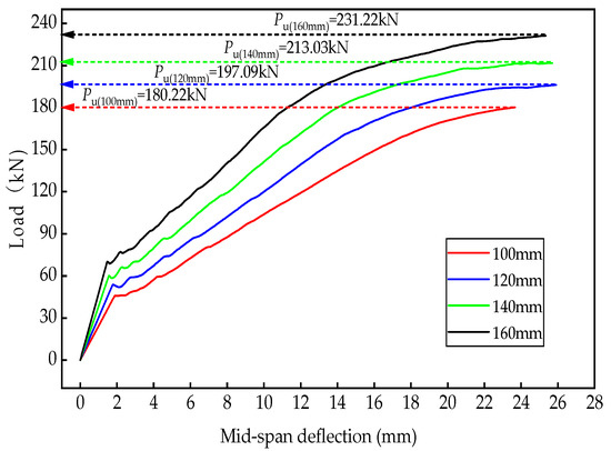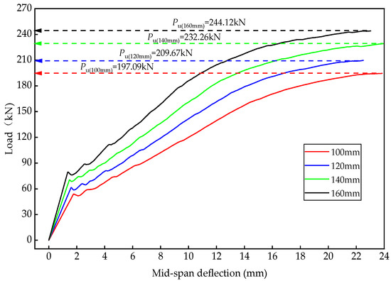 The web height also has an effect on the bending bearing capacity and stiffness of the bridge deck. The higher the web height, the greater the bending bearing capacity and stiffness, but too large a web height will significantly increase the deck deadweight, and at the same time have an unfavorable effect on the under-bridge clearance. Therefore, it is necessary to analyze the correlation between web height and bending bearing capacity. According to the experience of similar projects, combined with the standardized manufacturing dimensions of components, web heights of 100 mm, 120 mm, 140 mm, and 160 mm were taken for variable parameter analysis, and the numerical simulation results are shown in Figure 7.