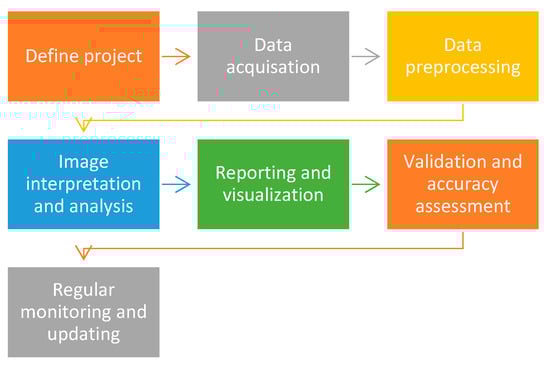 Several detailed steps are followed to use remote sensing effectively in the construction industry, as shown in Figure 2. For the project objective definition stage, the specific goals and objectives of using remote sensing in a construction project should be identified. The tasks to accomplish, such as site selection, monitoring progress, volume calculations, structural inspections, or environmental impact assessment, will be determined. The appropriate remote sensing data sources based on the project requirements will be selected in the data acquisition stage. This process may include satellite imagery, aerial photography, LiDAR data, thermal imagery, hyperspectral data, or a combination of these. Different factors like resolution, coverage area, temporal frequency, and cost shall be considered. Data Preprocessing: Preprocess the acquired remote sensing data, which will be processed to enhance their quality and suitability for analysis. Software tools like ENVI 5.6, ArcGIS Pro 2.8, or Quantum GIS (QGIS 3.16) can assist in these preprocessing steps. Regarding the image interpretation and analysis stage, image interpretation and analysis will be performed to extract meaningful information for construction projects. Image classification is a fundamental technique in remote sensing analysis. It involves categorizing pixels or image objects into different classes or land cover types. Classification algorithms, such as Maximum Likelihood, Support Vector Machines (SVM), Random Forest, and Convolutional Neural Networks (CNN), are commonly used to automate the process. These algorithms learn patterns and spectral characteristics from training samples to classify unseen pixels or objects in the image. Reports, maps, and visualizations will be generated in the reporting and visualization stage to effectively communicate the remote sensing findings. The accuracy of the remote sensing analysis will be validated by ground-truthing or comparing the results with field measurements or existing ground-based data. The accuracy of the derived products, such as volume calculations or structural inspections, will be assessed by cross-referencing with ground-truthed data or established surveying techniques.