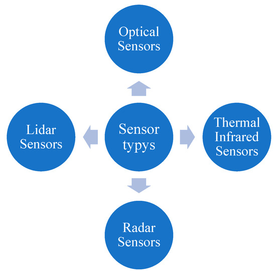 It is important to note that these merits and limitations can vary depending on specific sensor configurations, technologies, and applications within each platform. The commonly used sensors are optical, thermal infrared, Radar, and Lidar sensors, as shown in Figure 5. Therefore, different remote sensors used in remote sensing have their own merits and limitations, as shown in Table 3.