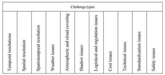 This section deals with the challenge of utilizing remote sensing in construction management in detail. We address and discuss some of these issues. The section is divided into five subsections depending on the challenge types shown in Figure 6.
