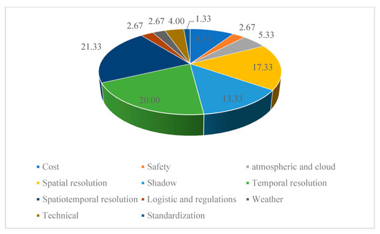 Concerning the project types examined in the reviewed literature, as shown by 44 peer-reviewed articles, they are mostly concentrated on temporal resolution, spatial resolution, and shadow issues and buildings (20%, 17.33, and 13.33%, respectively). These results are depicted in Figure 7.