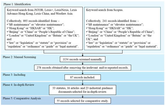 Figure 1) began with the Identification phase, during which the research team conducted searches across various databases and platforms, including JSTOR, Lexis+, LexisNexis, Lexis Advance Hong Kong, Lexis China, and Westlaw Asia (“legal sources”). Given that the scope of this study spans the legal, engineering and management disciplines, Scopus (“scientific source”)—the largest abstract and citation database of peer-reviewed literature—was also employed in the search process. To obtain the most relevant search results from these sources, jurisdictional filters (“Beijing”, “Hong Kong”, and “London”) and keywords in combinations of (“lift” or “elevator”) and (“law” or “legislation” or “statute” or “provision” or “regulation” or “ordinance” or “guide” or “legal material”) were used in the search processes. This initial effort (Phase 1) yielded a large number of records, with a total of 893 identified from the legal sources and an additional 241 from the scientific source.