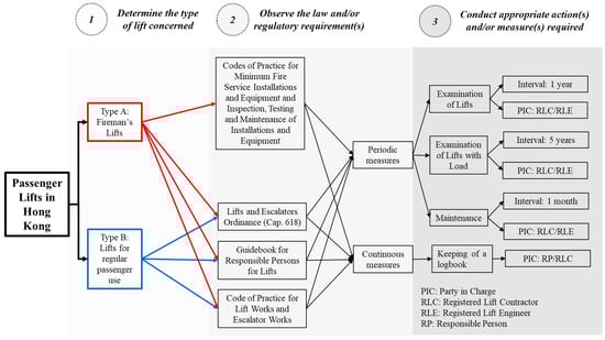 Figure 2 helps navigate the regulatory landscape of the relevant regulations. For both Type A and Type B lifts, the requirements of TSG T5002-2017 shall be fulfilled, where the abridged duties of the maintenance unit include the following: (i) formulate maintenance plans and programs; (ii) implement on-site safety protection measures during the maintenance period to ensure the safety of operations; (iii) formulate emergency measures and rescue plans and conduct emergency drills at least once every six months; (iv) set up a 24 h maintenance duty telephone to ensure that the fault is eliminated in a timely manner; (v) make detailed records of elevator failures and other situations in a timely manner; (vi) establish maintenance records for each elevator, classify them into the elevator technical files in a timely manner, and keep the files for at least 4 years; (vii) assist elevator users in formulating elevator safety management systems and emergency rescue plans; (viii) provide safety education and regular skill training for operators undertaking maintenance and archive education and training records for future reference; (ix) carry out at least one self-inspection per year; (x) arrange maintenance personnel to cooperate with special equipment inspection agencies to conduct regular elevator inspections; and (xi) in the process of maintenance, inform the elevator user in a timely manner if the hidden danger of the accident is found, and if a serious accident is found, report it to the local quality and technical supervision department in a timely manner.