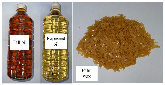 The vegetable oils used in this paper came from Guangdong Fufei Chemical Technology Co., Ltd., Guangzhou, China, and the vegetable oils included tall oil, rapeseed oil, and palm wax. The technical indicators of each vegetable oil are shown in Table 3, and the vegetable oil samples are shown in Figure 2.