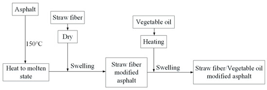 The composite-modified asphalt contained two modifiers: straw fiber and vegetable oil (tall oil, rapeseed oil, palm wax). The preparation process is shown in Figure 3.