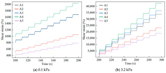 Figure 5 shows the creep recovery curves of different asphalts over 10 cycles at stress levels of 0.1 kPa and 3.2 kPa. It can be seen that under the two stress levels, the cumulative shear strain of the five asphalts at the high stress level is significantly greater than that at the low stress level. This shows that during the actual service of the road surface, long-term heavy traffic loads will significantly increase the risk of asphalt rutting and other defects, seriously affecting road performance and shortening the service life of the road surface. Under the two stress levels, the difference in the curves of the asphalt creep stage in the first second is small, but with the passage of time and the gradual accumulation of shear strain, the five curves gradually disperse. The curve position of the matrix asphalt is the highest, which shows that the incorporation of modifiers effectively improves the rutting resistance of asphalt. Among them, the curve of the palm wax/straw fiber composite-modified asphalt is at the bottom, and its strain value is significantly lower than those of the other asphalts, reflecting a stronger anti-deformation ability and indicating the effect of palm wax in improving the rutting resistance of straw-fiber-modified asphalt most notably. The curves of the tall oil and rapeseed oil/straw fiber composite-modified asphalts basically overlap, indicating that tall oil and rapeseed oil have similar effects on improving the high-temperature deformation resistance of straw-fiber-modified asphalt.