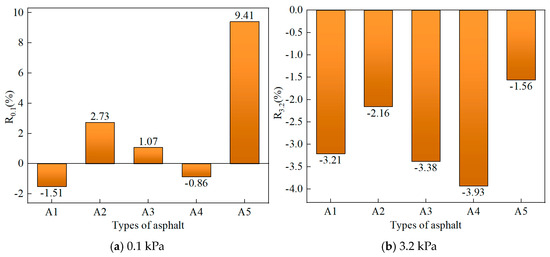 As can be seen from Figure 6, the R values of the four modified asphalts are all high, indicating that these modified asphalts can recover to their original state more quickly after being loaded and have better deformation recovery ability and elasticity. At the stress level of 0.1 kPa, the creep recovery rate of the palm wax/straw fiber composite-modified asphalt was the highest, reaching 2.18%. However, at the stress level of 3.2 kPa, the R values of the five asphalts were all reduced, reflecting the weakening of the deformation recovery ability of asphalt under high stress, which is consistent with the law of the time–strain response curve. Asphalt is a viscoelastic material, and its recovery ability will be weakened at high stress levels. Among the asphalts, the creep recovery rate of the straw-fiber-modified asphalt at the stress level of 3.2 kPa was the highest, reaching −2.78%. This is because the addition of straw fiber increases the viscosity of asphalt, thereby reducing irreversible creep and enhancing the asphalt’s resistance to high-temperature deformation.