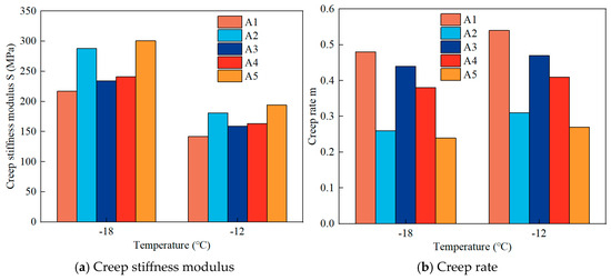 The creep modulus (S) indicates the stiffness of asphalt under a constant load at a certain temperature. The larger the S value is, the greater the elasticity of the asphalt is, the lower the viscosity is, and the more likely it is to produce low-temperature cracking when subjected to loads [25]. The creep rate represents the stress relaxation ability of asphalt. A decrease in the creep rate indicates that the material is less likely to recover after deformation, and the stress relaxation ability decreases, which makes it more likely to cause cracks. The BBR test results of the modified asphalts are shown in Figure 8.