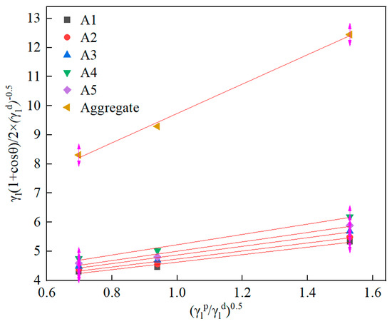In order to further verify the validity of the test results, for any asphalt sample, the surface energy γ of different test liquids was linearly correlated with cosθ, so the γ and cosθ of different asphalts and aggregates were linearly fitted, and the fitting results of the material surface free energy parameters calculated according to Formula (7) are shown in Table 9, with the fitting curve shown in Figure 9.