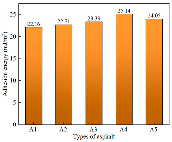 As can be seen from Figure 10, the adhesion work of the matrix asphalt to the aggregate is the smallest, and it is more likely to be damaged when it adheres to the aggregate. It is more likely to have defects such as peeling during the actual pavement service process. The four modified asphalts show increases to varying degrees in comparison. Among them, the adhesion work of the rapeseed oil/straw fiber composite-modified asphalt is the largest, which increased by 13% compared with the matrix asphalt and increased by 11% compared with the single straw-fiber-modified asphalt, indicating that it has the best adhesion to the aggregate, which is consistent with the calculation results of the surface free energy above. However, the surface roughness of the aggregate determines the surface free energy of the aggregate to a large extent. Therefore, in the process of polishing the aggregate surface, the roughness of all aggregate surfaces should be made as close as possible to reduce the difference in surface free energy caused by the different surface roughness of the aggregate.