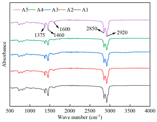 As can be seen from Figure 11, there is not much difference in the characteristic peaks of the infrared spectra of the base asphalt and the different modified asphalts. The main common characteristic peaks are as follows: stretching vibration of the C-H bond at 2920 cm−1 and 2850 cm−1; stretching vibration of the aromatic ring C=C at 1600 cm−1; bending vibration of C-H at 1460 cm−1 and 1375 cm−1. Therefore, according to the results of the original spectrum, the positions of the main absorption peaks before and after modification are basically the same, indicating that the chemical groups of the base asphalt and the modified ones have not changed significantly, and there is only a certain change in the peak intensity, indicating that no new chemical bonds were generated or broken during the modification process due to physical modification—that is, the modifiers physically mixed and dispersed in the base asphalt rather than chemically reacting to achieve the modification effect.