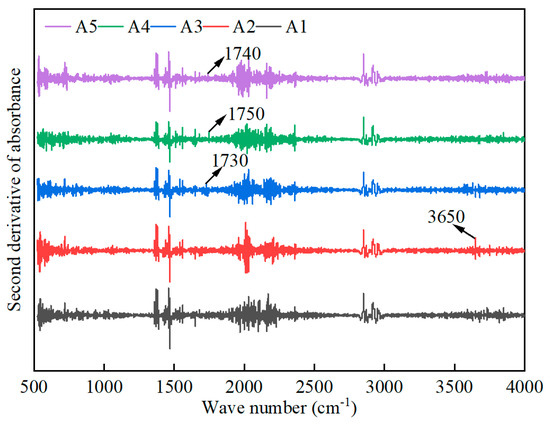 Some studies have pointed out that using the second-order derivative of the infrared spectrum to evaluate changes in characteristic peaks can significantly improve the resolution and sensitivity of the spectrum; amplify the detailed features of the peaks, especially weak absorption peaks and overlapping peaks; and help more accurately identify and distinguish samples. The existence and changes of different chemical groups are shown in [26]. This method can effectively remove the influence of baseline drift, provide clearer and more accurate spectral information, and facilitate in-depth analysis of the molecular structure and chemical composition of the sample. Therefore, this article continues to use the second-order derivative for analysis, and the results are shown in Figure 12.