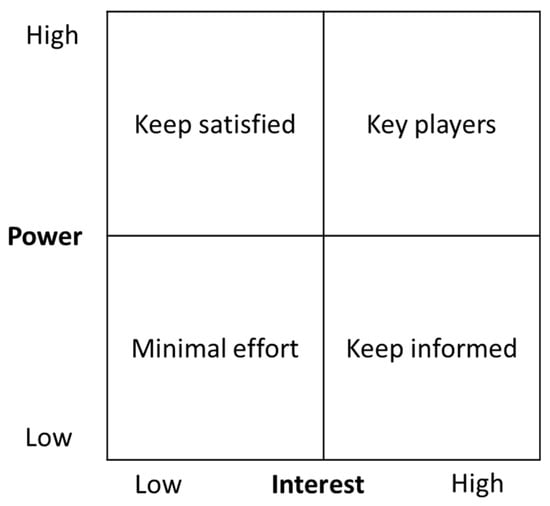 The 2D stakeholder mapping method of the power–interest matrix is used in this study. It is a widely used method to classify and analyze stakeholders based on power and interest [34]. Four stakeholder groups are defined based on the power–interest matrix (Figure 1), including key players (high power and interest), stakeholders to keep satisfied (high power but low interest), stakeholders to keep informed (high interest but low power), and stakeholders with minimal effort (limited power and low interest) [34].
