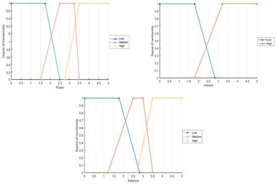 Step 3: The membership function, as the input and output function required by the FIS, is mainly used to illustrate the uncertain value of attributes. Since a crisp threshold cannot be defined for the power and interest attributes, a trapezoidal membership function is used in the fuzzification process to define uncertain values of stakeholder attributes (Figure 3).