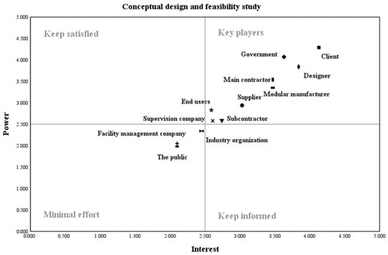Five power–interest matrices at different stages of OSC project delivery were developed (Figure 4, Figure 5, Figure 6, Figure 7 and Figure 8). It can be seen that the majority of OSC stakeholders can be classified into the two categories of Key players and Minimal effort at the different stages of project implementation. More specifically, the key players include the client, government, designer, main contractor, modular manufacturer, supplier, end users, subcontractor, and supervision company at the “conceptual design and feasibility study” stage (Figure 4). Comparing the power and interest attribute scores of stakeholder groups at this stage with the overall average scores across the five stages, the most significant difference observed is the change in the government’s scores. The government’s power score at this stage is 4.07, and its interest score is 3.63. In contrast, the overall average scores across all five stages are 3.47 for power and 3.30 for interest. Therefore, compared to other stages, the government shows greater interest in the social effects of OSC and has a more significant influence on its implementation during the “conceptual design and feasibility study” stage.