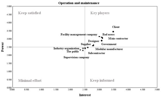 The power–interest matrix at the operation and maintenance stage.