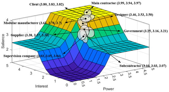 Based on the characteristics of power and interest, the salience has been introduced. It can be described as the extent to which managers prioritize the demands of competing stakeholders [15]. Therefore, this study adopts a 3D stakeholder mapping method on the power–interest–salience decision surface, placing the central point of salience on the 3D decision surface (where salience refers to the attributes of OSC stakeholders in terms of power and interest) and mapping the range of changes according to the dynamic changes in power and interest. When the interest value of stakeholders is relatively large, salience will be biased in the direction of the larger interest axis, and when the stakeholder’s power is larger, the salience will be biased in the direction of the larger power axis. When both are large, salience will be at the highest point of the entire surface. By observing the range of salience variation among different stakeholders on the surface, decision-makers can better identify the changes in stakeholder attributes at different stages of an OSC project. At present, existing research has successfully used this model for visual analysis. For example, Eskafi et al. [11] successfully analyzed the importance and prioritization of stakeholders in port master planning by introducing salience based on the two attributes of power and interest; Poplawska et al. [41] introduced the salience attribute based on the analysis of power, urgency, and legitimacy to analyze the prioritization of stakeholders in extractive companies.