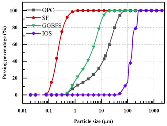 The raw materials used in this study included ordinary Portland cement (OPC) 52.5R, ground granulated blast furnace slag (GGBFS), silica fume (SF), iron sand (IOS), and high-range water-reducing admixtures (HRWRAs). SF and GGBFS were added to promote secondary hydration, which enhances the mechanical properties. A summary of oxide compositions is presented in Table 1. Iron sand with a particle size of 80–120 mesh was used for better fiber dispersion. Using iron sand instead of river sand benefits the environment [30] as it is a waste product from the iron industry [31,32]. Incorporating iron sand as an aggregate in HS-ECCs can reduce waste and positively impact the environment while simultaneously enhancing mechanical properties [33]. Figure 1 illustrates the particle size distribution of the binder and iron sand. Ultra-high-molecular-weight polyethylene (PE) fibers, with a length of 18 mm and a diameter of 24 μm, were used. The properties of the fibers used in preparing HS-ECCs are detailed in Table 2. HRWRA was utilized to maintain workability. UEA, which is a combination of CEA and MEA, was incorporated by partially replacing cement by mass in the mixture.