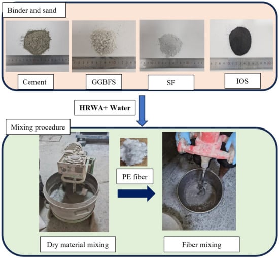 The mixing procedure was divided into two parts: dry material mixing and fiber mixing, as shown in Figure 2. After adding water and HRWR, cementitious material was blended with sand at 140 rpm for 10 min. After achieving fluid consistency, PE fibers were added and mixed at 420 rpm until there were no dry fibers or fiber lumps. The mixing procedure was adopted to maintain proper dispersion throughout the mixture.