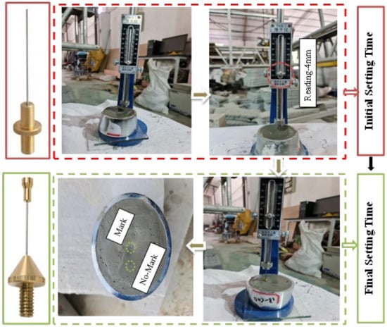 The setting times of the HS-ECC mixtures were determined using a Vicat apparatus following the Chinese standard GB/T 1346-2011 [41] as shown in Figure 3. Each mixture was placed into a conical mold with a bottom diameter of 75 mm ± 0.5 mm and a top diameter of 65 mm ± 0.5 mm. The initial setting time (IST) was assessed 30 min after the addition of water to the mixture. The IST is defined as the point at which the needle of the Vicat apparatus penetrates to a depth of 4 mm ± 1 mm from the base of the mold. Following the IST measurement, the mold was rotated 180 degrees to measure the final setting time (FST). The FST was determined using a specialized FST needle and was considered reached when the needle left no impression on the mold’s surface. Three samples were prepared for each mix proportion to ensure the reliability of the results.