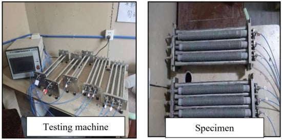 For measuring autogenous shrinkage, corrugated plastic tubes with a length of 420 ± 5 mm and an outer diameter of 29 mm ± 0.5 mm were utilized [42] as shown in Figure 4. The mixture was poured carefully into the tubes while on a vibrating table to avoid air entrapment. The tubes were clamped to prevent extension of length. Three specimens were prepared for each mix to ensure accuracy and repeatability. The specimens were set in the testing machine 15 min before the FST, with the initial measurement taken from the FST. The specimens were cured in a standard curing box with a temperature of 23 ± 2 °C and a relative humidity of 95%. The readings were automatically recorded by the machine every 30 min. The autogenous shrinkage of the specimen at time ‘t’ was calculated using the following equation: