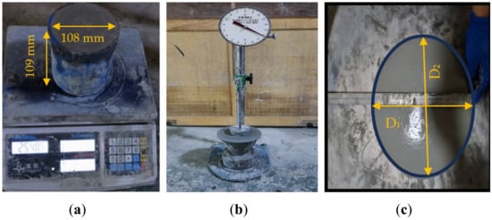 The apparent density test [43] measures the mass per unit volume of the mortar. The density of the matrix was determined using a one-liter cylindrical bucket with a diameter of 108 mm and a height of 109 mm. Figure 5a shows the experimental setup for apparent density test. This test was conducted immediately after the mixing procedure was completed to ensure the results reflected the fresh state of the mortar. To ensure accuracy and consistency, three specimens were prepared for each mix proportion.