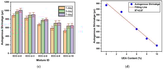 Figure 7a illustrates the impact of UEA on the autogenous shrinkage of HS-ECCs. Autogenous shrinkage measurement started from the FST to exclude the effects of chemical and plastic shrinkages, which have a minimal impact on civil engineering works. The results show a significant reduction in autogenous shrinkage with the increasing UEA content.
