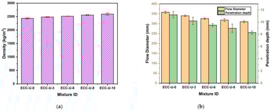 It was observed that the apparent density remained essentially unchanged with varying contents of UEA, although a slight increase was noted as the UEA content increased. This increase in density can be attributed to the expansive reactions of CEA and MEA with water, which reduce porosity and create a denser cement matrix. Table 6 and Figure 8a illustrate the apparent density across different UEA contents. The highest density was recorded for the mixture with 10% UEA, falling within the normal concrete density range of 1950 kg/m3 to 2800 kg/m3.