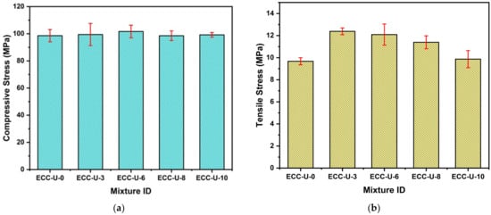 Figure 9a and Table 7 illustrate the impact of UEA content on the compressive strength of HS-ECCs after seven days. The data indicate that the addition of UEA has a negligible influence on compressive strength. Specifically, at the 7-day mark, the compressive strength of the mixture without UEA was 98.58 MPa, which increased to 99.43 MPa at a 3% UEA content. It further increased to 101.68 MPa at a UEA content of 6%. This slight increase in compressive strength with a higher UEA content is likely due to the formation of a denser cement matrix resulting from the reaction of an expansive admixture.