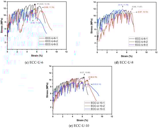 Tensile stress–strain curves of iron sand HS-ECCs at various UEA percentages.