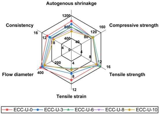 Figure 11 illustrates that the mixture without UEA exhibited high autogenous shrinkage, high consistency, a large flow diameter, and high tensile strain, with both tensile and compressive strengths falling within acceptable ranges. As the UEA content increased to 3%, a significant reduction in autogenous shrinkage and an increase in compressive strength were observed, while tensile strain, flow diameter, and consistency showed declines.