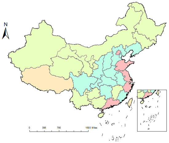 Before performing K-means clustering, it is essential to select the optimal number of clusters, denoted as K. In this research, the elbow method is employed to determine the optimal K value. The elbow method [58] is a way to determine the optimal K value using a graph of SSE and K values. The idea of the algorithm is that as K continues to increase, the data are segmented in more detail, and the SSE gradually decreases. When the K value is smaller than the actual number of clusters, the SSE value changes greatly. When k is equal to the actual number of clusters, the SSE value changes more gradually as the K value increases. Consequently, the graph between the SSE and K values is an “elbow-shaped” line chart, with the “elbow” being the optimal K value. In Figure 3, the blue line represents the relationship between SSE values and the number of clusters. And the number of clusters is determined to be K = 3. The clustering findings of the 30 provinces and municipalities are displayed in Figure 4, where three distinct colors represent the three different clustering results. To make the results clearer, the provinces clustered in different regions are marked with different colors in Figure 5. The specific provinces and their characteristics are detailed in Table 5.