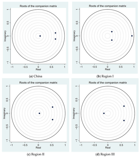 Before using the PVAR model, it is essential to ascertain the most effective lag order for each model. An excessively large lag period will result in a significant reduction in the degrees of freedom and will compromise the accuracy of the model’s estimates. Conversely, a lag period that is too small will lead to a substantial loss of sample data. Therefore, using Stata17, the lag order of the model was calculated based on the Akaike Information Criterion (AIC), Bayesian Information Criterion (BIC), and Hannan–Quinn Information Criterion (HQIC), and the results are displayed in Table 9. Grounded on the ideas of minimizing AIC, BIC, and HQIC [59], the optimal lag order of the PVAR model in China is 1 order, and Region I, Region II, and Region III are 1 order.