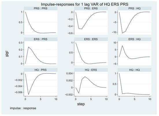 Once the lag order was determined, the PVAR model was examined using the System Generalized Moment Estimation (System GMM) method [60]. The regression results for the PVAR model are displayed in Table 10. Firstly, for HQ, row 1 of the table indicates that there are two coefficients that are statistically significant, and both of them are significant at the 1% level. That is, HQ is very much influenced by ERSs and PRSs, with one-period-lagged ERSs having a significant positive effect on HQ, while one-period-lagged PRSs have a significant negative effect on HQ. This implies that as the environmental regulatory structure increases, HQ construction will increase, while as the state ownership structure increases, this will inhibit the growth of HQ construction. Secondly, regarding ERSs and PRSs, one-period-lagged versions of both variables have a significant effect on their own, and both are also significant at the 1% level with respect to each other.