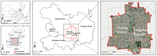 This study selected Dongcheng District and Xicheng District in Beijing as the research scope (Figure 1) for the analysis of children’s outdoor activity pace. Beijing is actively promoting the construction of child-friendly cities, with Dongcheng and Xicheng districts serving as the core regions, covering a total area of 92.5 square kilometers. These districts are the central hub for national politics, culture, and international exchanges, designated as a key area for preserving historical and cultural heritage, and serve as a crucial showcase for the capital city’s image. Despite their esteemed status, the dense urban layout and compact land use patterns in this area resulted in a scarcity of outdoor space, making it challenging to meet the physiological and psychological needs of children for outdoor activities. Therefore, this study focused on Dongcheng and Xicheng districts, aiming to creatively optimize the limited space while preserving and respecting the precious historical and cultural heritage within the region. The goal was to create an environment where children could play and learn in a safe, comfortable, and enjoyable setting, providing insights into the development of child-friendly cities.
