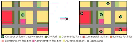 To effectively eliminate service blind spots in children’s outdoor activity space and comprehensively improve spatial provision, several measures should be considered (Figure 3). Firstly, there should be a concerted effort to enhance the accessibility and coverage of children’s outdoor activity space by fully utilizing existing urban spatial resources and activating dormant land resources to meet children’s daily usage needs. Furthermore, the configuration of children’s outdoor activity space should be coordinated with the surrounding population density to ensure that these spaces not only meet the practical needs of residents but also effectively serve the local community. This implies starting from the residents’ needs, understanding and adapting to their lifestyles and activity habits [28]. Combining population development trends and demographics, it is important to allocate children’s outdoor activity space reasonably in terms of quantity, scale, and type, based on the behavioral and demand characteristics of the user groups, thus avoiding mismatches between populations and facility configurations.