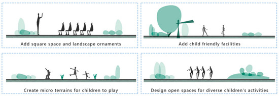 To enhance the enjoyment and interactivity of outdoor activities for children, four key aspects can be considered (Figure 4). Firstly, increasing the square footage and incorporating diverse landscape elements, such as expansive green areas and varied features, can provide larger activity zones for children, stimulating their curiosity and creativity. Secondly, creating miniature terrains, such as small hills, sandpits, and water channels, not only adds variety to play but also enhances children’s physical coordination and spatial awareness. Thirdly, adding child-friendly facilities, including safe play equipment, interactive walls, and movable toys, can improve the play experience and foster social and practical skills [29]. Lastly, designing open space for diverse activities [30], such as multifunctional sports fields, art creation areas, and learning corners, can cater to children’s needs in movement, creativity, and learning, encouraging participation in various activities and promoting well-rounded development. Implementing these measures can significantly enhance the enjoyment and interactivity of outdoor activities for children, creating a richer and more enjoyable environment for their growth.