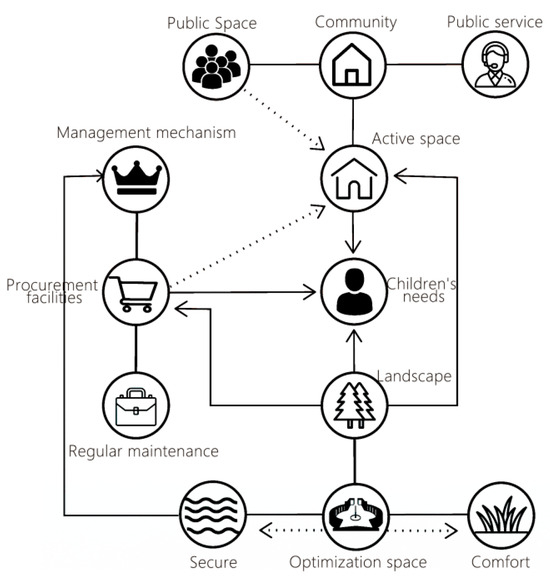To enhance the service management standards of children’s outdoor activity space, there should be a comprehensive optimization and upgrade of current management strategies (Figure 5). Firstly, regular comprehensive inspections of all facilities should be conducted to ensure compliance with relevant safety standards and to ensure that the facilities are always in optimal condition. Secondly, strengthening management and maintenance work is crucial. This can be achieved through establishing effective supervisory mechanisms and implementing regular facility renewal and upgrade plans to ensure that outdoor activity spaces meet the evolving needs and safety standards of children [31]. Additionally, collecting and analyzing user feedback regularly is essential for better understanding their needs and expectations [32,33]. This information will be a valuable resource for improving and optimizing children’s outdoor activity space, further providing a safer, more enjoyable, and comfortable environment for children.